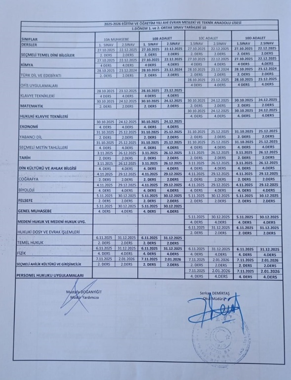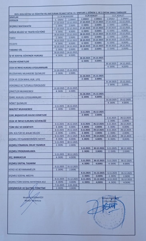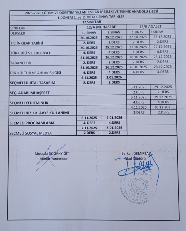 1. Dönem Ortak Sınav Tarihleri