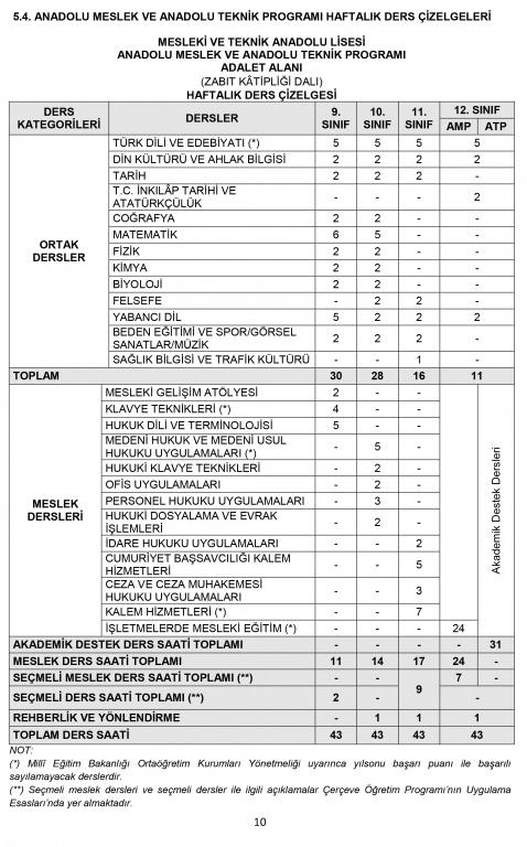 Adalet alanı öğrencilerinin eğitim öğretim süresince görecekleri haftalık ders çizelgesi