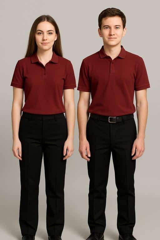 Okul kıyafetlerimiz aşağıda gösterildiği gibi koyu kırmızı üst kısa kollu tisört veya uzun kollu sweetshirt. Alt Siyah pantalon şeklindedir.